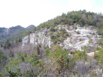 | 善防山の山頂を後に笠松山へと下る。善防山の下りも登りと同じような露岩の出た急な下りだが、登ってきた道ほどではない。少し下ると正面に綺麗な円錐形の笠松山そして人工的な地形になった石切り場の荒々しい岩壁が見えてくる。 標高200m辺りまで標高差約50mの急坂を下るとここから尾根歩きになる。尾根道を快適に歩くと分岐になり直進し、少し急坂を下ると吊橋に出る。吊橋を渡るとすぐ岩場になる。標高差約10mの大きな岩を登る。岩にはクサリが下がっていてクサリを使って登ってもいいが滑りにくい岩なのでクサリなしで十分登れる。岩登りの体験ができて非常に楽しい。 |