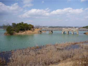 | お寺を後に播磨下里駅へと引き返した。峠になったところは切り通しになっていて、空には朝渡った吊橋が見えた。峠からジグザグの車道を下ると一直線の広い道路に出る。突き当りが善防中学校で右に巻くと皿池に出る。皿池には中島がありなかなか美しい。池の周りには板の遊歩道が整備されていてなかなか素晴らしくゆったりした雰囲気を味わえる。 池を過ぎた辺りで予定の列車より1時間早い列車に乗れそうなので少し急いだ。列車には十分余裕で乗車できた。粟生から加古川線で加古川へ、駅前からタクシーでぷくぷくの湯へ行った。ぷくぷくの湯では有馬温泉の腺脈なんだろうか茶褐色の温泉に浸かってゆっくり温まった。約1時間温泉でゆっくりしてタクシーで加古川に戻り、JR新快速で帰阪した。予定より1時間早く行動できたのでビアブルグ梅田で乾杯。皆さん楽しい山歩き会、ありがとうございました。 |
