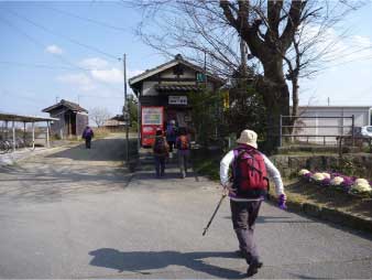 | 3月15日、松愛会山歩き会で播磨の善防山、笠松山を縦走した。大阪8時11分新快速姫路行きで出発。加古川で加古川線に乗換粟生駅へ、ここから北条鉄道に乗り、播磨下里で降車した。 播磨下里駅で出発準備をして10時30分歩き始めた。駅前から県道43号を南へ、81号との交差点を渡ると野田池があり、これから登る善防山が池に映っていた。少し先に進むと農協前のバス停がありさらに少し先に山へ入る細い道があった。その道の入口に善防山登山口の案内標石が建っていた。 |
