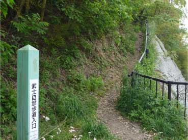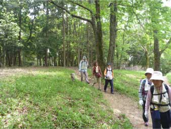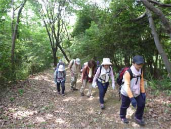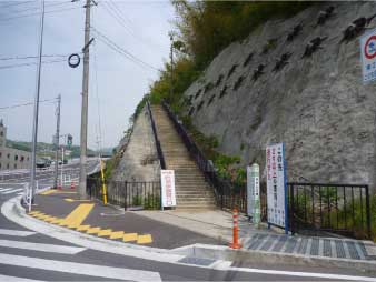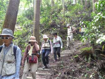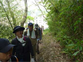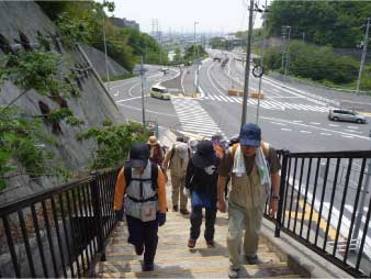 | 5月17日、松愛会山歩き会は阿武山に登った。阪急茨木市駅から車作行きの阪急バスに乗り、安威で降車した。 バス停の先に阿武山登山口が整備されていて階段になっていた。府道46号線茨木亀岡線はかなり以前から工事されていて登山口も姿を変えていた。本の最近工事が完了したようで登山口には階段がつけられていた。 階段を登ると武士自然歩道入口の標識がありそれに沿って阿武山へと向かった。登り始めて標高100m辺りまでは急登でジグザグの道を登る。 登り詰めるとバス停から見えていた赤い鳥居に着く。阿武山稲荷の額縁がついていて大きな鳥居だ。ここから緩やかな道を歩いて行くと阿武山稲荷に到着する。お参りして、今日のコース紹介をした。 |