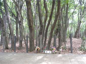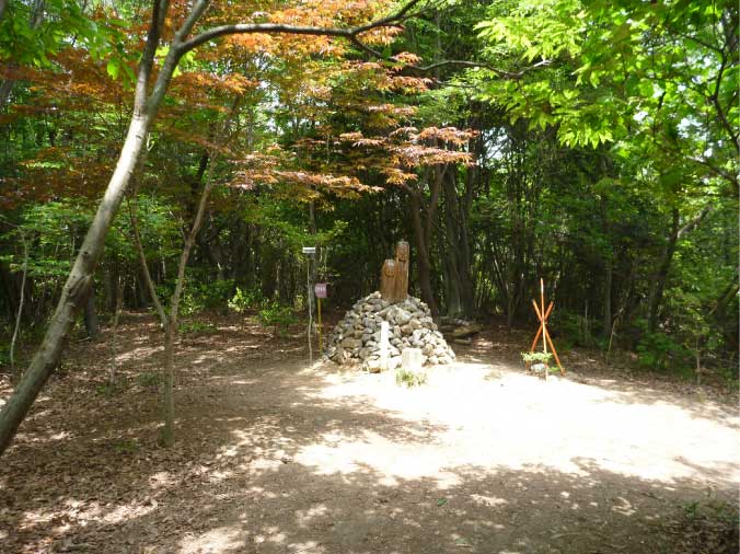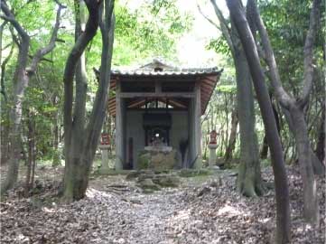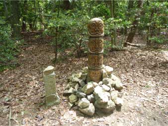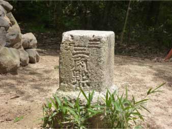 | 緩やかな登りを登って行くと、古墳への分岐につく。尾根に沿って南側に戻るとほんの少し高くなったところが阿武山古墳の墓室だ。標高約210mの尾根頭に作られた古墳で盛土はない。盛土がないので古墳という雰囲気はあまりないが木々の中に墓室と標されている。近くに説明板があり、貴人の墓とも書かれていて藤原鎌足の墓とも言われている。 | ||||||||||||