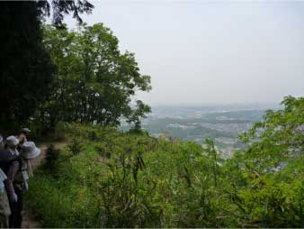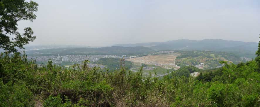 | 阿武山古墳から分岐まで戻り、尾根道を山頂へと登る。緩やかな登りを快適に登って行くと左側が開け展望が楽しめる。茨木市街、山手台、造成地、あいがわCC、石堂ヶ岡などが展望できる。印象的なのは万博の太陽の塔も遠くに眺めることができる。さらに一登りすると山頂に到達する。 | ||||||||||||