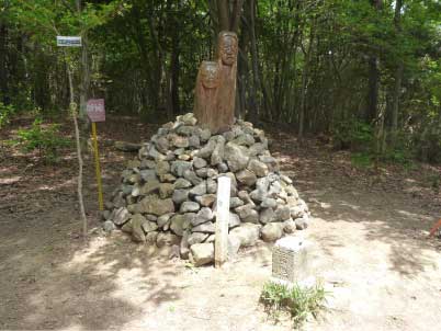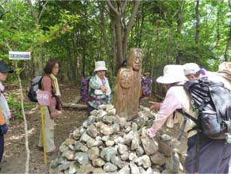 | 阿武山は、標高281mで三等三角点になっている。山頂からの展望は雑木林であまり望めない。山頂には小石が積み上げられ、この山に請っていると思われる人が作ったトーテンポールが立っている。山頂広場で昼食にした。 | ||||||||||||