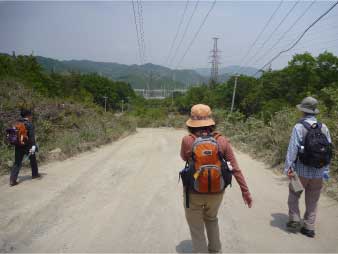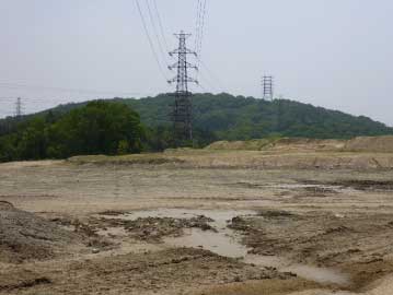 | 午後は、阿武山を下山し、北大阪変電所前の阿武山口へ下った。下り初めは少し急で階段などもあった。坂を下り終えると林道になり、木々の間から左手に竜王山が見えてくる。また造成地から振り返ると阿武山も見える。 造成地が広がり、ダンプカーが砂煙を立てて通過していく。阿武山口までそんな中を口に手を手ながら下った。 |