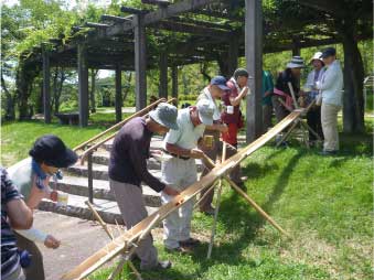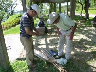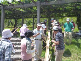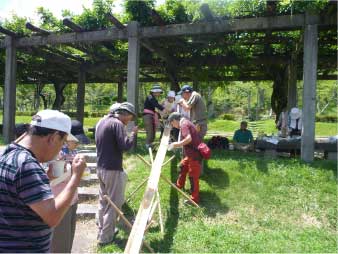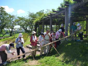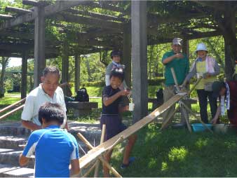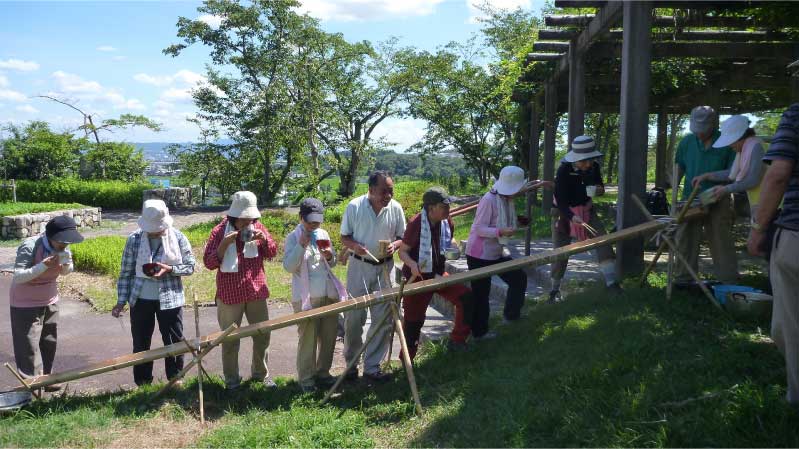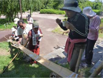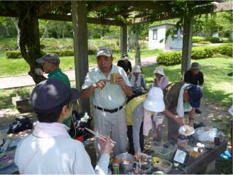 | そうめんを勢い食べるものだから直ぐにお腹が一杯になる。少し間を空けてビールを飲んだりウインナーを食べたり別腹を楽しんだ。 第2ラウンドも、楽しくそうめん流しを楽しみことができた。第3ラウンドは、かなりお腹が一杯でギブアップ気味になってきた。そこへ小学生を連れた親子連れがやってきた。2人の男の子に挑戦してみるかと云うと、うれしそうに箸をとった。 わいわい言いながら2人の兄弟は喜んで、ついに親御さんも参加した。初めてそうめん流しを見て食べることができ大層喜んでくれた。もてあましていたそうめんもすっかり完食だ。 大層盛り上がったそうめん流しになった。竹樋を作っていただき、遠くから重たい竹樋を運んでくださった方に感謝します。ありがとうございました。 そうめん流しの後は、花の里温泉祥風苑で温泉に浸かりゆっくりくつろいだ。そして高槻に戻り、とりせいで反省会となった。楽しいひと時をありがとうございました。さっそく来年のリクエストを頂き感謝いたします。 |