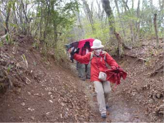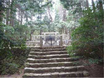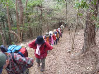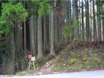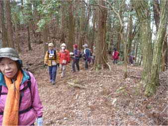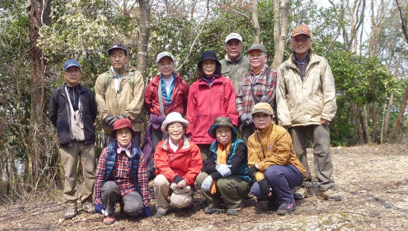 | しばらく行くと沢が崩れていてそこを高巻きして進むと、金蔵寺方面の分岐に出て一安心、ここから少し急な登りを頑張って登る。林道を2回クロスして山頂の林道に出て登り切ると淳和天皇陵に到着した。 淳和天皇陵にお参りして小塩山山頂に登る。小塩山は、標高642mで雑木林とアンテナ設備があり展望は全くない。山頂で記念写真を撮っていよいよカタクリ鑑賞だ。 |