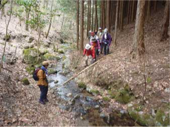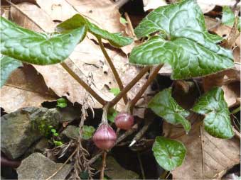 | 数回渡渉しながら進むが倒木もありだんだん心配になる。そのとき登山道の先に夫婦のハイカーが写真を撮っておられたのを見て一安心だ。 写真を撮っておられたところに着くと、フタバアオイが咲いていた。その先に期待のカタクリが一輪咲いていた。曇っていてやはりカタクリの花は開いていなく閉じたままだった。 しばらく登ると登山道の両脇にカタクリが出現し始めた。開いたカタクリは見られないものの可憐な蕾のようなカタクリを沢山見て皆さん大喜びだった。 |