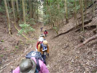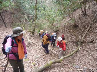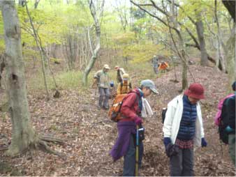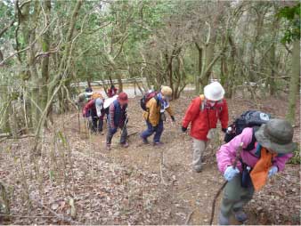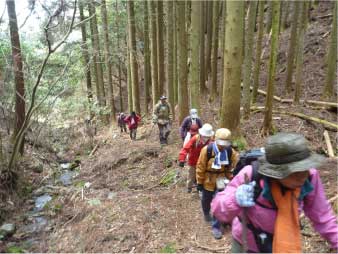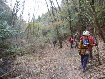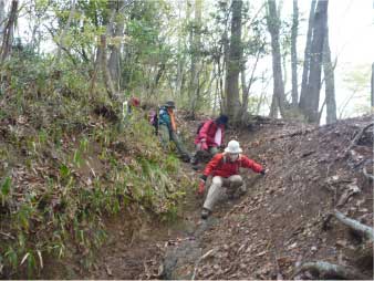 | 森林公園から小塩山へ登山口に入る。すると道は左右に分かれていて左は尾根道のようで山頂まで約45分のようだ。我々は右にとり、谷筋を登ることにした。この谷はカタクリ谷と呼んでいる人もいる谷でカタクリが期待できそうだ。しかし、しっかりした踏み跡はあるが、道はかなり荒れていて山頂にたどりつけるか少し心配だ。 | ||||||||||||