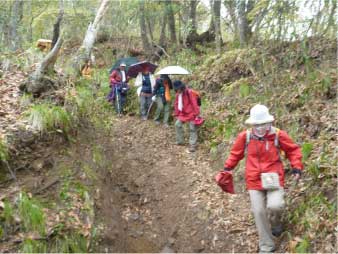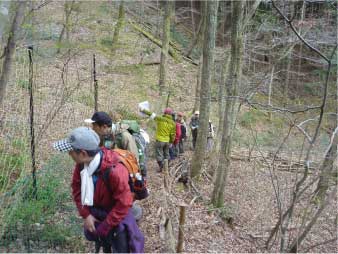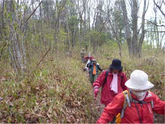 | カタクリ谷のカタクリ鑑賞を終え、尾根筋に出る。尾根筋に出てここで道を間違えてしまった。左にとって巻き道を進むがどうも頭上の山頂に向かう気配がない。8分ほど行ったところで引き返し、今度は右に巻いて進んだ。よく見るとこの分岐に白いテープで小さな表示があったが確認できなかったのだ。 | ||||||||||||