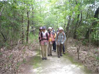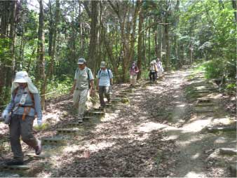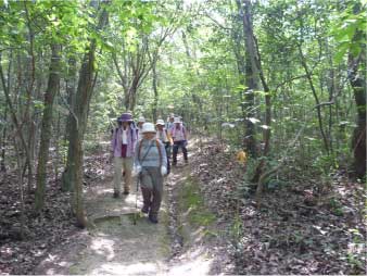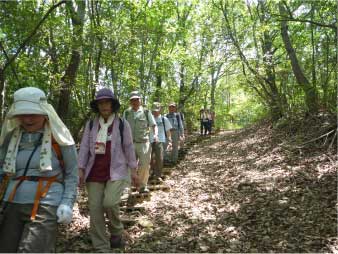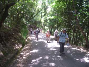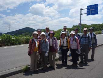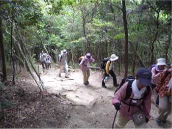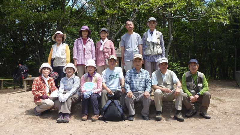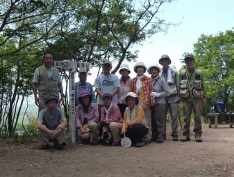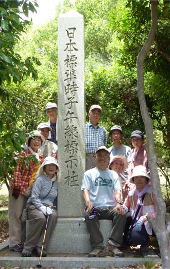 | みんな元気なので、雌岡山を一旦下山して日本標準時子午線標示柱を下った。折りしも3日前の6月10日は時の記念日、日本標準時子午線標柱を見た後、雌岡山へ400m、標高差約100mを登り返した。みんな元気な若者?だ。 | ||||||||||||