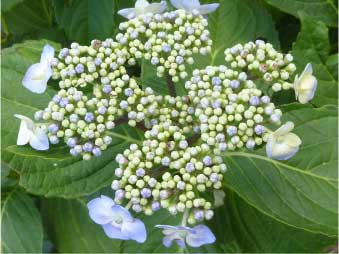 | 雌岡山の登山口から舗装された道を登って行く。しばらく登ると雌岡山梅林がありそのわきに可愛いアジサイが咲いていた。登り切ると神社の駐車場があり、その上が神社で山頂だ。 | ||||||||||||