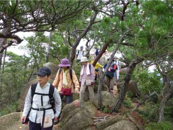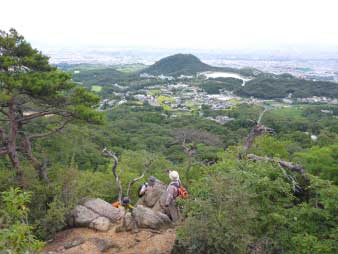 | 鷲林寺を参拝して、多宝塔の右端からお寺を出ると、右上に若宮神社がある。若宮神社の鳥居をくぐると社殿の左側に登山口がある。 この登山口は、パノラマコースになっていていきなりの急登になる。岩などがあり少し厳しい登りだが素晴らしい展望が待っているので我慢して登る。登山口から約10分ほど登ると尾根頭になり大きな岩が展望岩になっている。 |