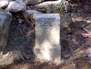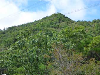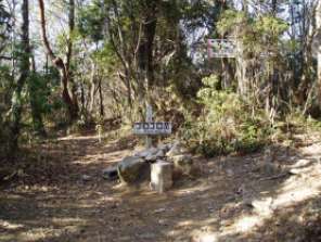 | しばらくかなり急な下り道を下って行くと尾根頭の大きな岩のあるところに出た。そこからカベノ城を眺めるとまだかなり下になる。またこの道を戻ってくるのは少し厳しいようなのでこの岩で前進をあきらめ分岐に戻ることにした。 カベノ城は、標高483m、分岐が標高約560mなので標高差80mを往復するのは少し厳しい。機会があれば行ってみたいと思う。健脚であれば往復でもいいが、そうでなければ登りをとりゆっくり登ったほうが良さそうだ。 |