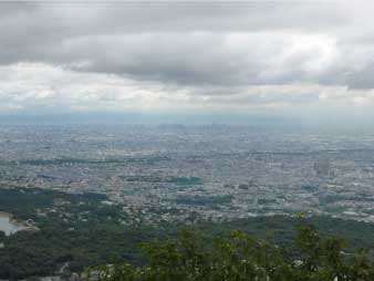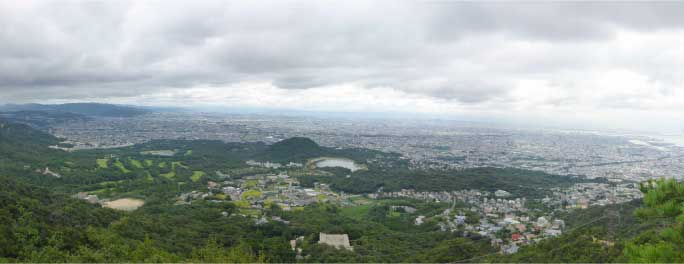 | 展望岩からは360度のパノラマで素晴らしい。北のほうから五月山、石切山、ビッグハープなど、正面に甲山、その奥に生駒連山、金剛連山そして大阪湾と大阪市街が一望できる。話題の阿倍野ハルカスなど眺めを楽しんだ。 | ||||||||||