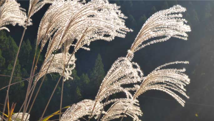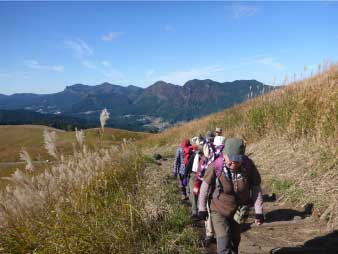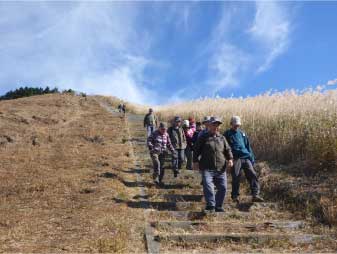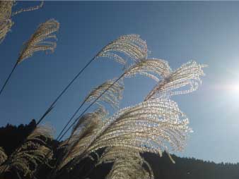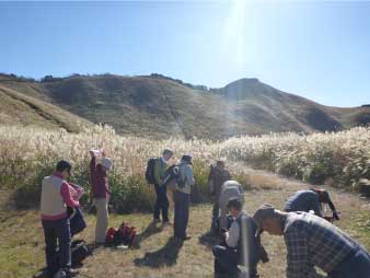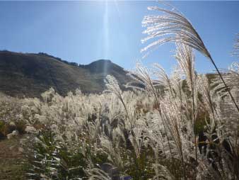 | まばゆい太陽でススキの穂が銀色に輝いている。衣服調整して、おかめ池へゆっくりススキや周りの景色を楽しみながら登っていった。 | ||||||||||