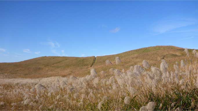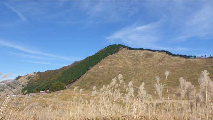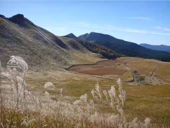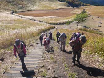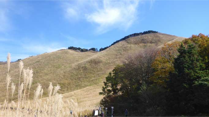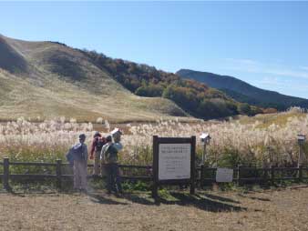 | おかめ池池に到着、ススキで池の様子は分からないがこれから山に登ると全容が見えてくるだろう。おかめ池は、標高約700mにあり雨水と亀山からの地下水が溜まったもので川がないため水量の変化はあまりないそうだ。 日本昔話のお亀伝説など多くの伝説があり、火山の火口とも言われている。春になると山焼きが行われ、春から夏にかけては一面に青い絨毯が敷かれたような風景になる。 そして今訪れた秋は、すすきに覆われ陽射しを浴びて銀色、金色に輝いているはずだ。それでは山に登っておかめ池を眺めてみよう。 |