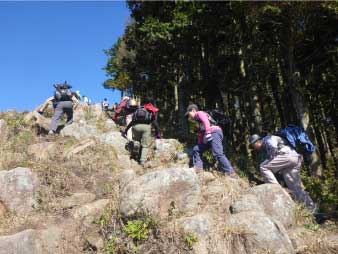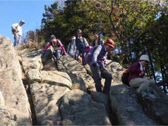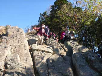 | 亀山峠から今度は亀山へと登り返した。一つ目のピークは難なく越えその下りは、また露岩で先程よりは少し厳しそうだ。賑やかに降りる人真剣に降りる人いろいろだ。鞍部に下りそして登り返せば亀山の山頂だ。 | ||||||||||