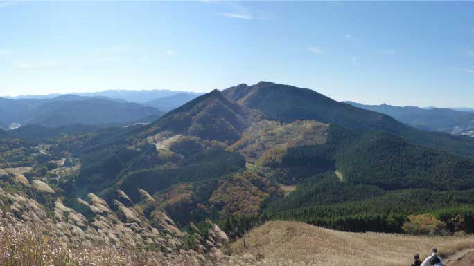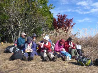 | 亀山は、標高849mで素晴らしい展望だ。曽爾高原といわれるところはススキの原になっているが、尾根の東側は樹林帯で山頂付近をしたから見るとモヒカン頭のようになっている。 少し風はあったものの素晴らしい景色を楽しみながら、お弁当をいただきピクニック気分を味わった。 |