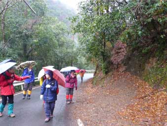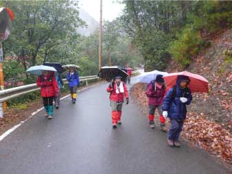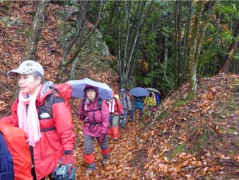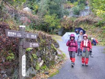 | 12月19日、松愛会山歩き会で荒神峠に行った。年初に、清滝から入り米買い道を登り荒神峠へのコースを行ったが、今回は保津峡駅からツツジ尾根を登り荒神峠へのコースだ。後半は同じ水尾までの米買い道の後半を行った。 保津峡駅から歩き始める。生憎の天気で霧雨が降り続いている。雨が強いようであれば水尾へ直接行こうかと思ったがこの雨だとなんとか行けそうだ。 保津峡駅を出発して赤い橋を渡りそぐ右折し、コーナーの登山口から急登が始まった。 |