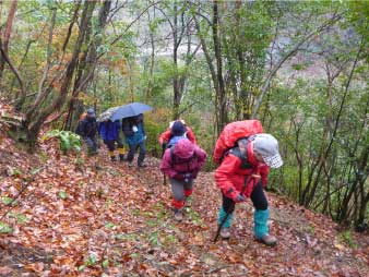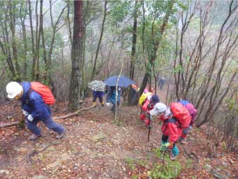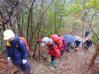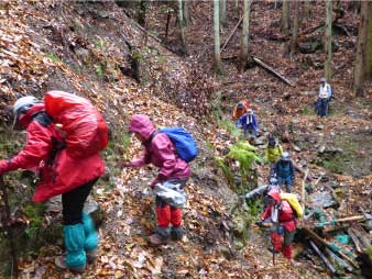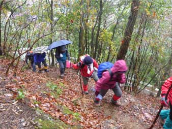 | 急登をゆっくりゆっくりと登り始める。この崖を登り詰めると緩やかな尾根道になるのだ。それまでみんなに頑張ってもらうことにした。一登りすると木々の間から保津峡が見えてきた。少し立ち止まってまた急登を登る。 | ||||||||||||