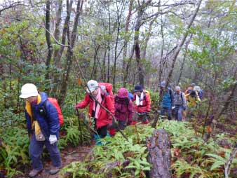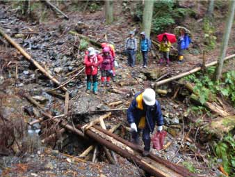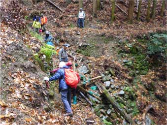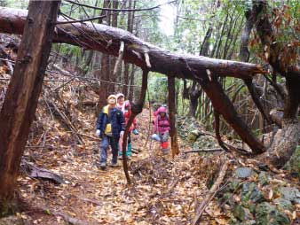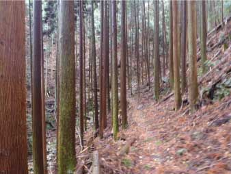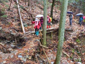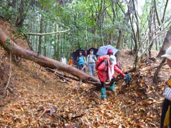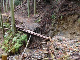 | しばらくはいい道だったが、何ヶ所か道が崩壊、特に沢渡りの部分が上からの沢崩れで容易に渡れなくなっている。また所々に倒木が横たわっていてくぐったり巻いたりと大変だ。 米買い道は数年前に、水尾自治会、京都愛宕研究会、右京区役所などが道の整備を行い立看板などを設置されたが、その後の台風などの風水害で大きな崖崩れ3ヶ所、大きな倒木数ヶ所が発生している。 米買い道は、良いハイキング道なので、事故が発生する前に当局の改修工事が望まれるところだ。 |
