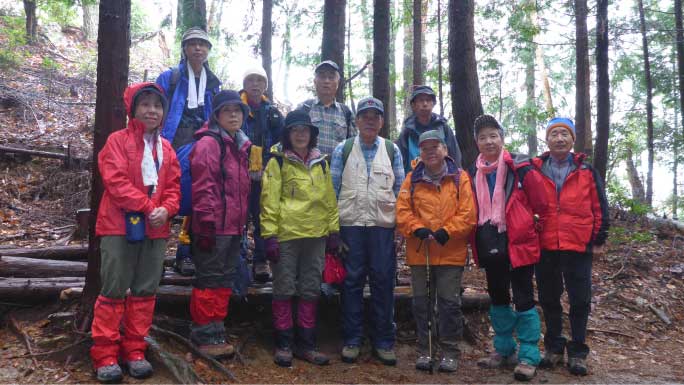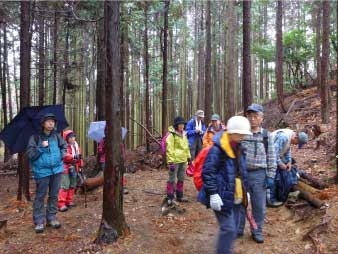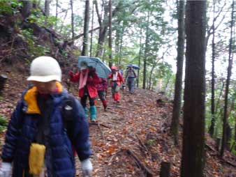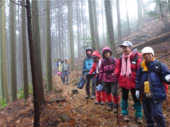 | 急登を登り切ると緩やかな尾根道になるが、荒神峠まではまだまだ遠い。途中愛宕山の山頂が霧の中にわずかに眺めることができた。まだかまだか、もうちょっともうちょっと繰返し、途中で一息ついで歩いているうちに今年1月に登ってきた米買い道が右側に見えてきた。 米買い道との合流点、荒神峠標高395mに到着、ここで小休止をとる。峠と言っても杉の樹林帯で峠からの展望は全くない。この峠を直進してまた急登を登れば、愛宕神社の表参道に合流するが、我々は水尾へと米買い道の後半を進んだ。 |