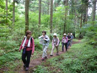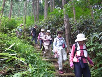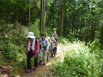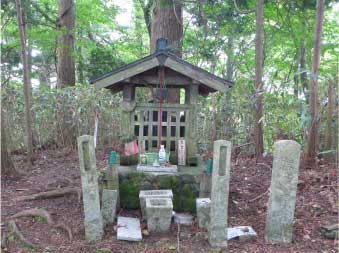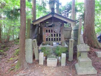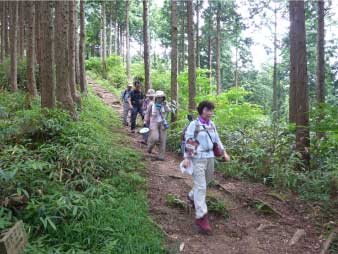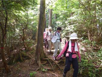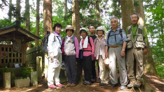 | 奥ノ院を出て30分余りで摩尼山山頂に到着、ここで昼食にした。山頂には、如意輪観音が祀られている。山頂からの展望は木々で望めない。杉林の合間の若葉の緑に風に揺れて光、素晴らしい。山に登ってしか味わえない感覚だろう。 | ||||