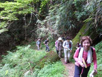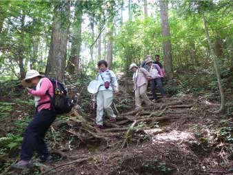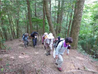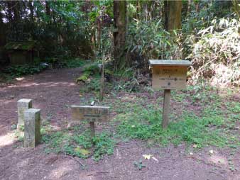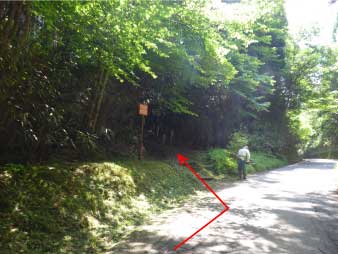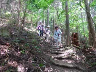 | 御廟橋から東側の広い道路に橋を渡り出る。ここから広い道を少し歩くと右側にチエンのかかった道がありその道に入っていく。程なく林道に出てそのまま進むと林道は右に曲がるは直進して山道に入る。 登山道に入ると沢沿いの道はかなり荒れていて歩きにくい。大雨で登山道が川のようになり削られて荒れたのだろう。 沢を登り切ると尾根に出て摩尼峠を通過する。ここから尾根道になり標高差約120mの急登を一気に登る。今日一番の厳しい登りかと思う。 |