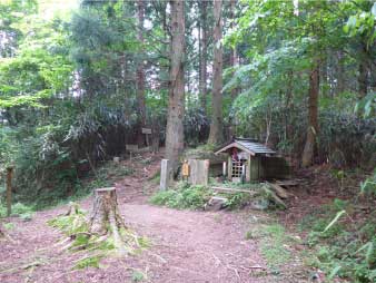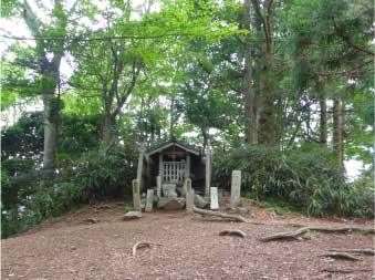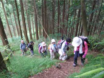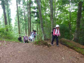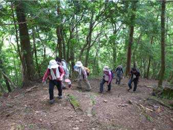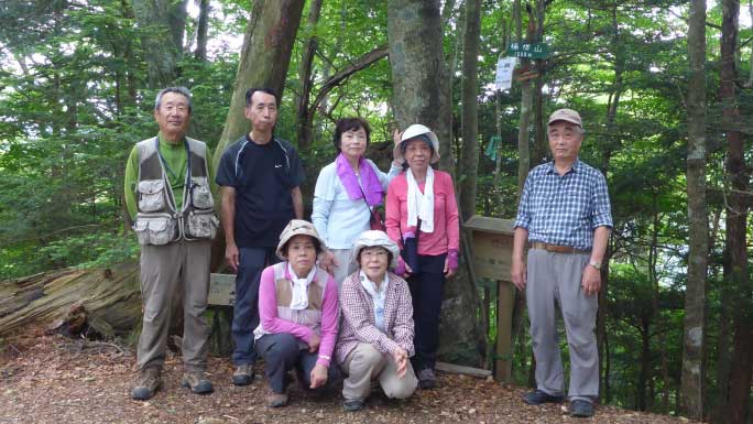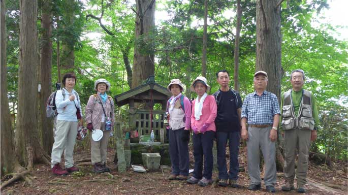| 最後の登りは標高820mの車道から山頂まで標高差95mを登り切るだけだ。みんなで頑張って15分転軸山山頂に到着。 転軸山は、標高915mで山頂に弥勒菩薩がお祀りしてある。これで三山登頂したのでゆっくり休憩して下山にかかった。当初転軸山公園方面から下山を考えていたが、奥ノ院へ下る道は通行規制もなくよく整備された道だったので奥ノ院へ下った。 |