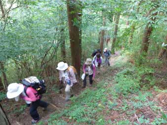 | 最後の3座目の転軸山へ楊柳山の北西尾根を進み少し行った先から道なりに南西の尾根を進んでいく。さらに途中の小ピークから西に急坂を下る。やがて子継峠に降り、ここから沢道を南へどんどん下る。やがて車道に出て再び転軸山の標識に沿って登り始める。 | ||||