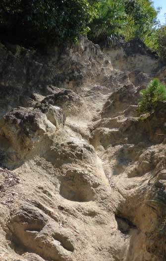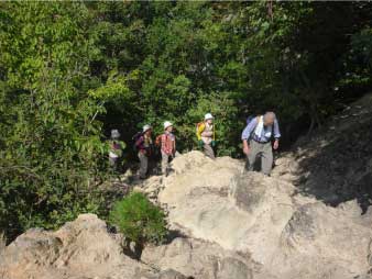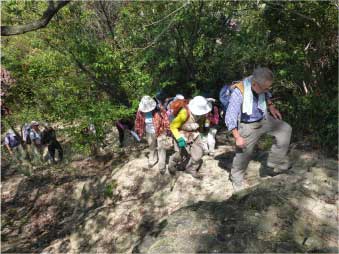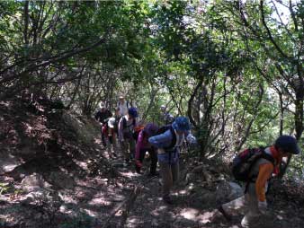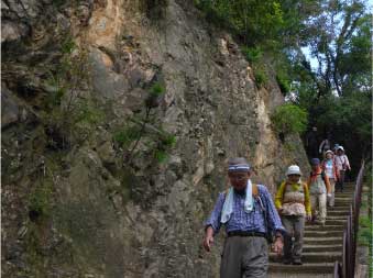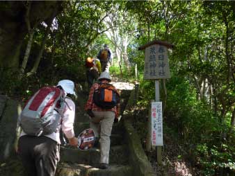 | 再びジグザグの急登、岩場をゆっくり登る。高齢者もおられたので登りのピッチはおさえて息がはーはーしない程度で登った。標高290m辺りの岩場を登り、左に巻いてしばらく登ると石段があり、登り切ると須磨側の山頂に到着。 | ||||