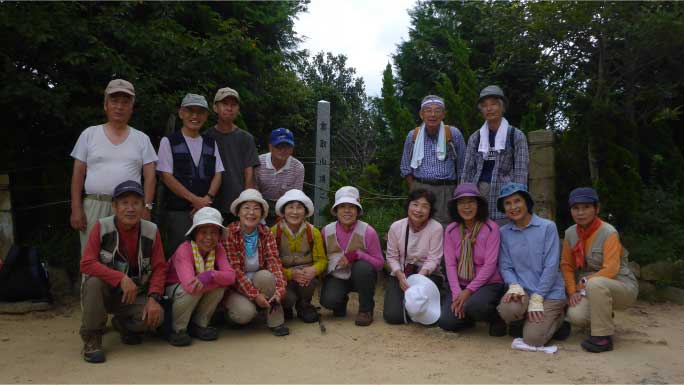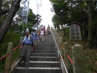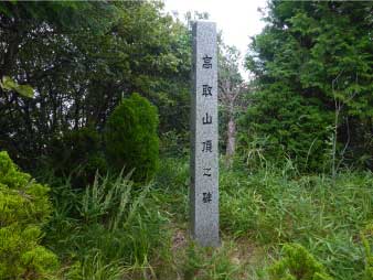 | さらに上に登ると広場になっていて高取山の山頂になる。高取山は、標高328mで山頂からの展望はなくたくさんの神様がお祀りしてある。山頂で記念写真を撮って右奥から回りこんで高取神社境内に下山した。 | ||||