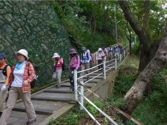 | さあいよいよここから山道の急登になる。フェンスの先から右手に少し降りて尾根を回りこんでここから尾根筋の直登になる。ジグザグの尾根道をゆっくりゆっくり登っていく。標高120m辺りからさらに急登になり、階段道から岩場の登りになる。標高170m辺りまで岩場の急登が続き樹木が開けたところに着く。須磨アルプスの山々の裾には住宅街が広がり、自然と造形物がみように調和している感じも受ける。 | ||||