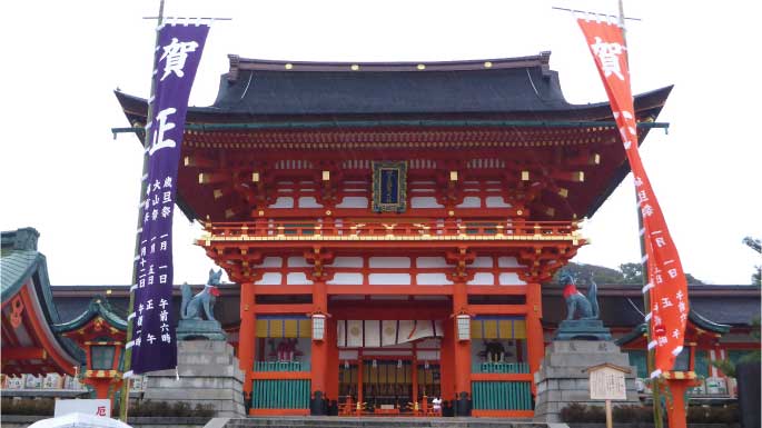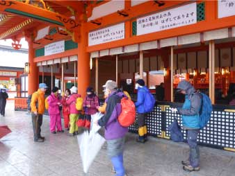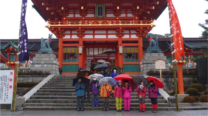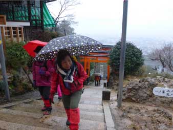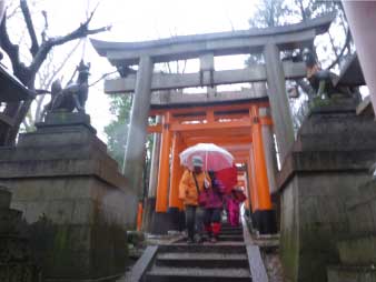 | 1月15日、松愛会山歩き会で稲荷山に登り、下山後は伏見で新年会を行なった。清清しい新春の陽を浴びて年初の山歩き会を行ないたかったが生憎の雨降りになった。 予定より20分遅れで稲荷山へと出発した。朝早くとあってまだお参りする人は少ない。支度途中の商店街を抜けると朱塗りの伏見稲荷大社が目に飛び込んでくる。実に鮮やかな朱色の社殿や鳥居は、雨降る中でも毅然としている。 伏見稲荷大社は、全国に30000社あるといわれる総本宮だそうだ。楼門前で記念写真を撮り、拝殿から本殿へとお参りし、山歩き会の安全と皆の健康を祈った。 |