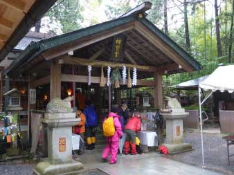 | 雨の中ひたすら石段を登り、四辻に到着、雨のためここから引き返そうかと思ったが一ノ峰を一周するのが30分と記されていたので行くことにした。茶店の横から右回りで石段を登った。三ノ峰、間ノ峰そして二ノ峰へと登って行った。 | ||||