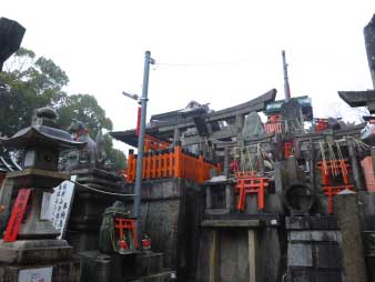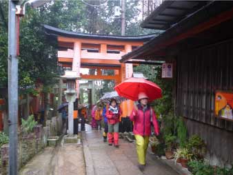 | 二ノ峰から5分で稲荷山山頂の一ノ峰に到着した。これで今日の目標は達成だ。一ノ峰には、末広大神が祀られていて周囲にはたくさんの朱色の小さな鳥居が山のように立っている。稲荷山の山頂標識は燈篭に貼り付けられていて、標高は233mだ。 雨はさらにきつくなってきたので石段で転倒しないよう十分注意しながら下山した。約30分で四辻に戻ってきた。茶店の軒下に入るとここかお店なので中に入るなと言われ早々に下山した。全員そろったらぜんざいでも頂こうかと思っていたがこんな店には入りたくない。お稲荷さんで商売できているのを傘に着て商いの常識を疑う茶店だ。 |