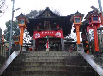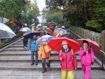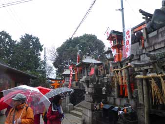 | 少し寄り道して神宝神社へ、ここで願い事を人形に託していた人もいた。元に戻って四辻へと登って行った。雨が次第に強くなり、雨で薄暗くなりみんな傘を指しているので写真はほとんど撮れなかった | ||||