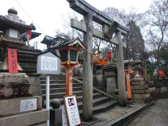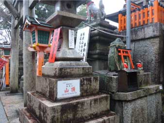 | 本殿の左から稲荷山へと登り始める。本殿横を少し登って右手の千本鳥居をくぐって行く。山全体が信仰の対象になっていて鳥居は山全体にあり、鳥居は1万本ほどあるそうだ。千本鳥居を抜けると稲荷奥社があり右奥にここに「おもかる石」がある。 一対の石灯籠があり、この前で願い事をして石灯籠の空輪(頭)を持ち上げる。持ち上げた時軽ければ願い事が叶い、重ければ叶わないのだそうだ。みなさんはどうだったでしょうか。 |