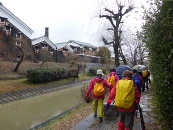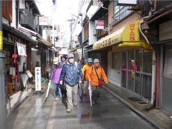 | 雨降りしきる中楼門まで下ってきた。雨に濡れながら伏見稲荷駅に戻り、しばらく衣服を整えたりして時間調整した。11時前の電車で伏見桃山駅へ、雨もやみ陽が射してきた。アーケードを抜け竜馬通りから伏見の名所疎水を眺め鳥せいに12時前に到着した。 | ||||