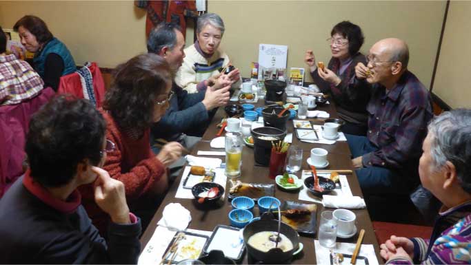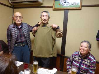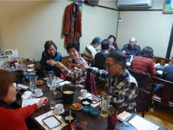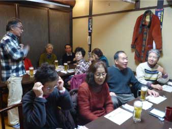 | 鳥せいで新年会を行なった。たれくちを飲みながら鳥料理を頂き本年も楽しい山歩きができることをみんなでを誓った。昨年ダウンしていたIさんが病気全快で山歩き会に復帰、みんなでお祝いした。MRCのM氏が会社卒業で山歩き会に初参加、これからもよろしく。そして不肖私には日本百名山登頂達成でみなさんから世界に一つのプレゼントを頂いた。皆さんありがとうございました。 本年は雨降りのスタートだったが、午後からは陽ざしのある天気になった。きっと今年も良い天気で楽しい山歩きができることを信じて頑張りましょう。ありがとうございました。 |