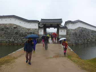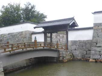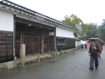 | 続いて赤穂城跡に入って行った。花岳寺から突当りのお堀を巻いて大手隅櫓を廻り込むと大手門だ。城内を進むと大石良雄宅跡長屋門がある。 | ||||