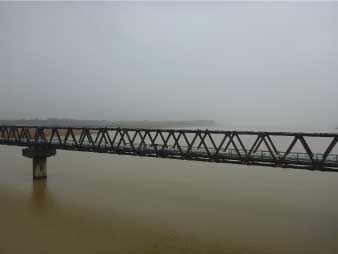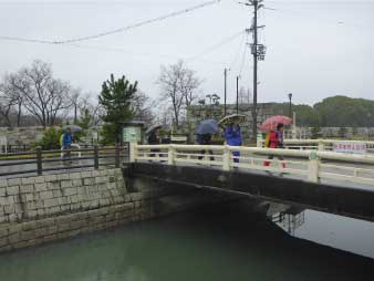 | 天守台を降り厩口門から下城し、本丸の石垣を楽しみながら本丸を半周して水手門から出て加里屋川を渡り一般道を進んだ。 千種川に架かる赤穂海浜大橋を渡った。橋の中央に方位盤があって現在位置の様子がよく分かった。右手の小さな橋の向うにかすかに岬が見えその先に唐船山があるのだろう。橋を渡って千種川に沿って唐船山へと歩いた。 |