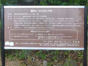 | 唐船山は、標高19mで小高い丘だ。東側を見下ろすと唐船サンビーチで遠浅の砂浜があり海水浴や潮干狩りで人気だそうだ。昔、日本が唐と交易していたときに、唐船が赤穂の沖で嵐に遭い沈没したそうだ。宝物を積んだまま沈没した船に土砂が積もって島となり、地続きの小高い山となったと伝えられているそうな。それで山頂でしこを踏んで見ると大阪のポンポン山のような音がしたがまんだらでもなさそうだ。 | ||||