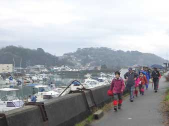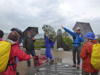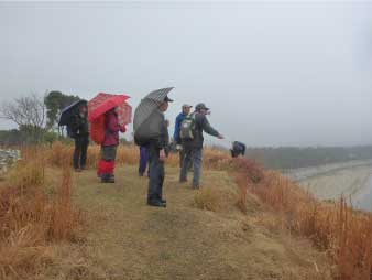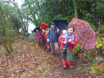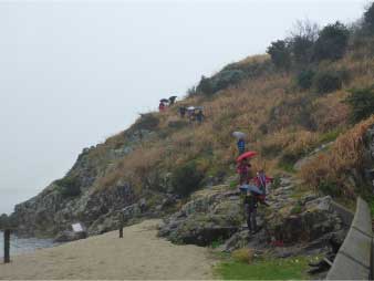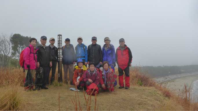 | 岬の外れのピーク手前までやってきた。唐船山の登山口で標高は4m位だろうか。全員気合いを入れて登頂開始だ。といっても気合いどころかみんなにこにこ顔だ。あっという間に唐船山に登頂。 | ||||
