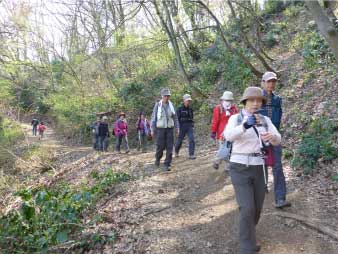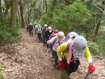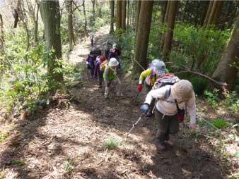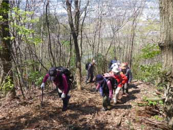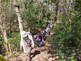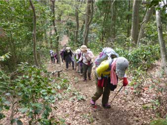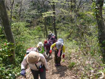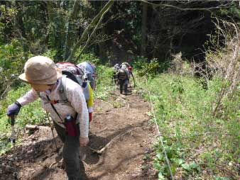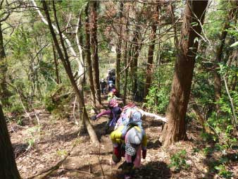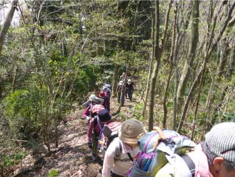 | 酒清水の左側が登山口でここから登り始める。登り始めるといきなり急登、粘土質の急斜面で滑りやすい、所々にトラロープが下がっている。標高100m辺りまで急登が続き、標高差約80mを頑張って登る。 まだまだ登りが続くが最初の急登よりは少し緩やかだ。標高200mのピークを越えたあたりで、前を行っているグループの歓声が聞こえた。カタクリの花が咲いていたのだろう。 |
