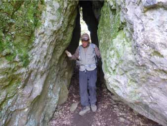 | 標高250m辺りから標高350mの文殊山奥ノ院へ標高差約100mを頑張って登りきる。 奥ノ院は、標高350.5mで二等三角点になっているが展望はない。山頂には、奥ノ院があり、阿弥陀如来、祭神は大国主命がお祀りしてある。 奥ノ院から急坂を少し下ると胎内くぐりの大岩がある。文殊山楞厳寺(りょうごんじ)の説明板によると胎内くぐりをすると知恵を授かるそうだ。ただし邪心があると岩に閉じ込められると言うが、閉じ込められなかったのでみんな邪心がなかったのだろう。 |