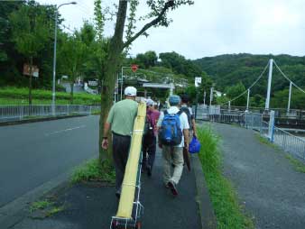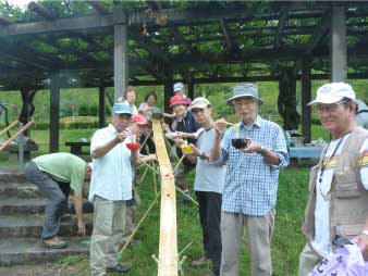 | 双方準備ができたところでそうめん流しを始めた。そうめんが固まって流れていったり、途中で止ったり、うまく取れた人なかなか取れなかった人、勢いついて回収笊まで一直線になったりと皆でわいわい言いながらそうめん流しを楽しんだ。今日2番目の大仕事は水運びだったがなんとか皆の協力でできた。 竹樋を整備し、ここまで持ち運びして頂いたIさんと皆さんに感謝します。また薬味等作って頂いた方にも感謝します。お陰さまで楽しいそうめん流しが演出できました。 そうめん流し終了後は、美人の湯につかってゆっくり時間を過ごした。高槻市に戻り居酒屋で反省会をしてご機嫌になったところで解散した。皆さんのご参加ありがとうございました。 |