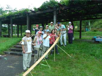 | 藤棚の下に竹樋を組み立ててそうめん流しの準備をした。竹樋の製作者が完ぺき主義者のようで組み立てにかなり時間がかかっているようだ。 かたや、そうめんをゆでるのも暑くて大変だが手際よく皆の協力でできた。雨が降るかもしれないのでそうめん流しの場とそうめんをゆでる場と水場が離れているため今日の最初の仕事だ。 |