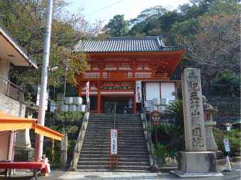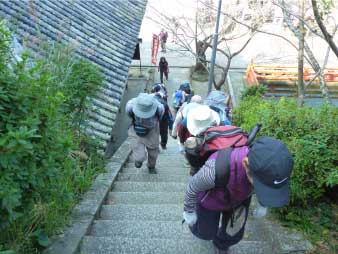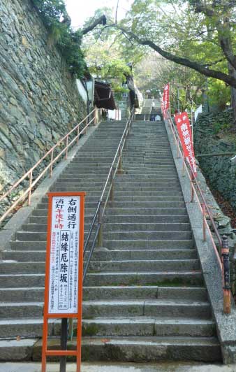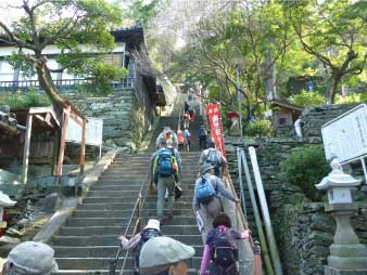 | 楼門の前の入口で入山料、200円(70歳以上100円)を納め目の前の長い長い石段を登り始める。石段は、楼門から本堂前広場まで231段あるそうだ。若き紀伊国屋文左衛門が結婚と出世の契機となる出会いをした坂だという。25段、33段、42段、61段と厄年を踏み越える石段だそうだ。それぞれの年輪と重ねながら石段を登ったのではないかと思う。 | ||||