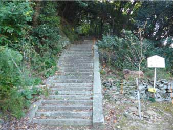 | 石段を登り切ると今度は朽ちかけた石段になり結構厳しい。鳥居があって今度はさらに長いきつい古い石段を登っていく。石段の簡易手すりにしがみついて登っている人もいる。 | ||||